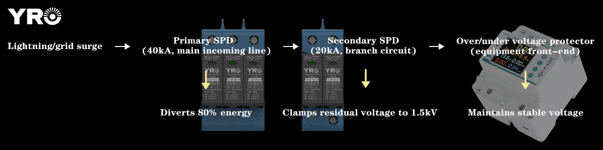 À partir de cela, on peut voir que les dispositifs de protection contre les éclairs et les dispositifs de protection de surtension et de sous-tension sont complémentaires: le SPD ne peut pas faire face à une surtension continue dans le réseau électrique, et à ce moment, un dispositif de protection de tension est nécessaire pour couper l'alimentation. Le protecteur de tension n'a aucune réponse aux surtensions de foudre au niveau de la nanoseconde et nécessite que SPD assure une protection transitoire.