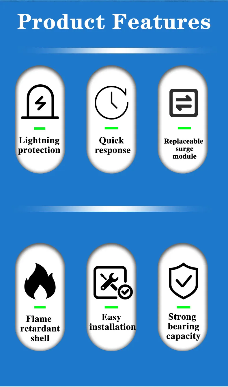 Nos entretiens de foudre de surtension peuvent protéger efficacement l'équipement électronique dans les systèmes d'énergie solaire contre les impacts de tension causés par les coups de foudre, les fluctuations de grille ou la décharge électrostatique. Ce type de protection est très utile pour le fonctionnement sûr des composants clés tels que les onduleurs et l'équipement de surveillance.